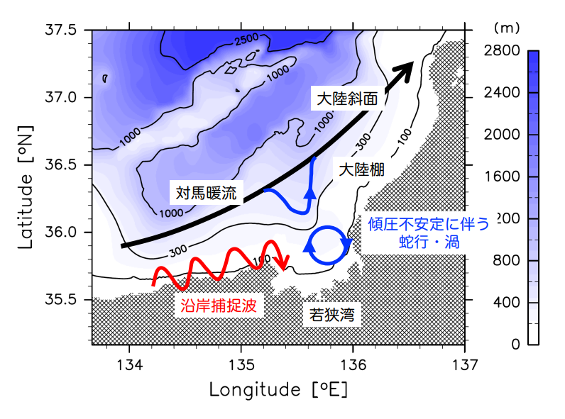 研究タイトル:「沿岸捕捉波」と「地形の影響を受けた傾圧不安定」による湾と外洋との海水交換 - 研究内容の概要文: